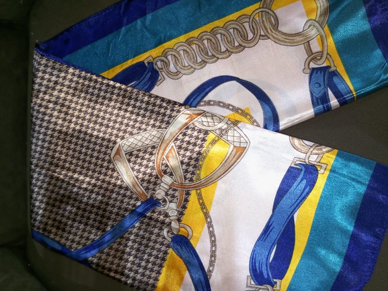 Effortlessly elegant, this silk scarf combines modern color blocking with a classic equestrian-inspired design. The rich mix of blue, gold, white, and brown tones adds depth and sophistication, while the chain and strap motifs give it a luxurious finish. Perfect for adding a refined accent to workwear or an evening outfit, this scarf brings timeless charm with a contemporary twist.