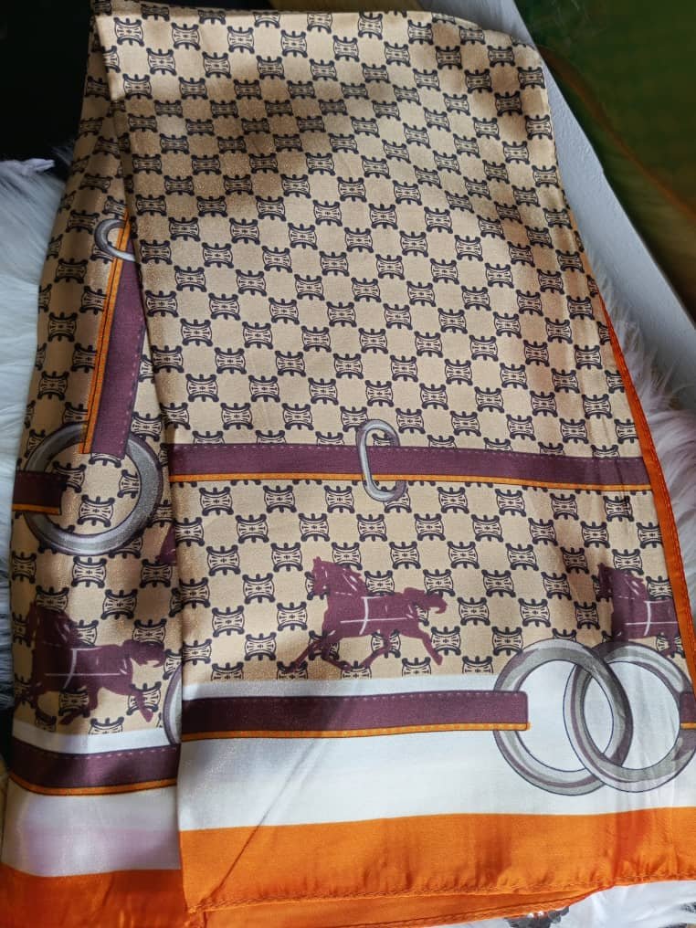 Sophisticated and versatile, this beige silk scarf is beautifully accented with subtle brown detailing. Its warm, neutral tones make it an essential accessory that pairs effortlessly with any outfit. Whether styled around the neck, draped over the shoulders, or tied as a headscarf, this piece adds an understated touch of elegance to your look.