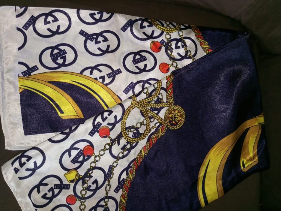 Elevate your style with this elegant silk scarf featuring a crisp white background adorned with intricate blue and gold designs. Its refined pattern and smooth texture make it a versatile accessory—perfect for tying around your neck, styling as a headscarf, or draping over your shoulders for a polished look. Whether for casual wear or a formal occasion, this scarf adds a sophisticated finishing touch to any outfit.